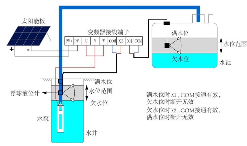 4.系统可在保护池或水塔中应用浮动开关来控制水泵的运行。 低水位探头可以安装在井中,以检测井水位,以便在低水位井时停止泵 .