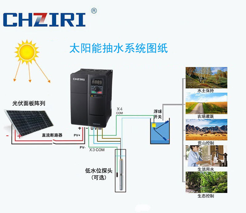 本产品ZSI800太阳能专用逆变器适用三相380V和单相220V 深井潜水泵改造成太阳能光伏水泵系统, 太阳能组件产生的直流电输入光伏水泵控制器,转换为交流电, 直流驱动各种水泵, 特别是井用潜水泵。