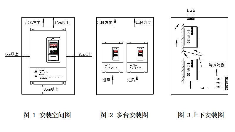 为使变频器冷却效果良好和维护方便,安装时变频器周围要留有足够空间并垂直安装(见图1);将两台以上变频器安装在同一控制柜内时,为了减少相互热影响,建议横向并列安装(见图2);必须上下安装时,为了使下面的变频器产生的热量不直接影响上面的变频器,请在它们中间加装分隔板(见图3)