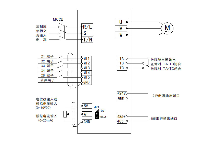 操作面板▲▼键设定、模拟电压信号设定、 模拟电流信号设定、端子组合设定、485串行通讯设定等。 |