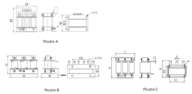| 电抗器型号 | 图号 | 功率 (kW) | 额定电流 | 电感 (mH) | 压降 | 绝缘等级 | 材质 | 重量 (Kg) | 产品规格 (±0.5mm) | ||