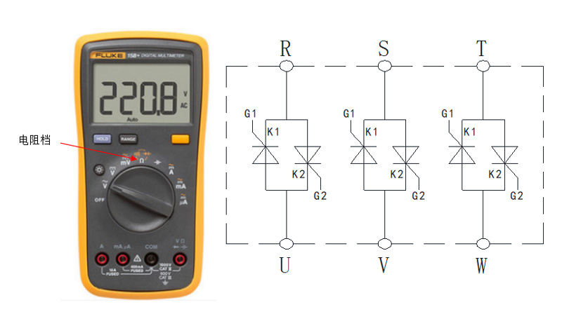 测量R与U、S与V、T与W、G1与K1、G2与K2之间的导通状态,便可判断其是否良好。