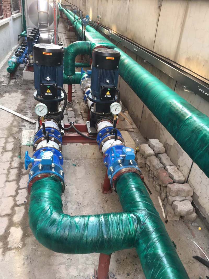 采用一台变频器控制两台补水泵,在系统需要大量补水时, 以变频方式起动第一台补水泵,达到工频运转后,切换至工频方式,然后再起动第二台补水泵,当系统压力达到给定值后工频运行停止,一台水泵以变频器方式运行,对系统进行补水 ,当系统不需要补水时,变频器可自动进行睡眠状态,使补水泵停止运行进入待命状态,这种工作方式使整个系统的压力保持恒定,真正达到了恒压补水的目的。