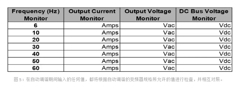 4. 执行调谐前和调谐后测量也可能有所帮助。尝试使用变频器的内置监控显示器来完成一个包含前后监控值的表格。如果用户成功地利用出厂默认设置进行自动调谐,则除直流母线电压外,后调谐中的所有变频器值都将低于预调谐值,直流母线电压在稳定状态下基本保持恒定。