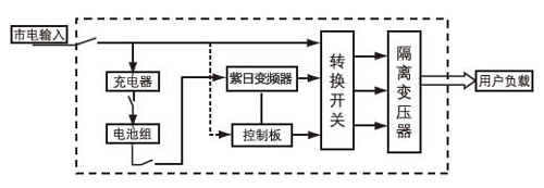 当市电供电正常的时,市电电源经过EPS的交流旁路和转换开关组成的供电通道、以及隔离变压器向用户的各种应急负载供电。这时用户负载所使用的电源是来自电网的市电电源,因此此时的EPS能够带各种电阻性、电容性和电感性负载。当市电供电中断或者超限时,EPS在很短的时间内,完成了从交流旁路供电到逆变器电池供电的切换操作,同时起动了逆变单元进入工作状态。用户负载使用的电源就是经过隔离变压器的EPS逆变电源。当市电恢复正常工作之后,EPS对逆变器执行自动关机操作,并且完成从逆变器电池供电到交流旁路供电的切换。